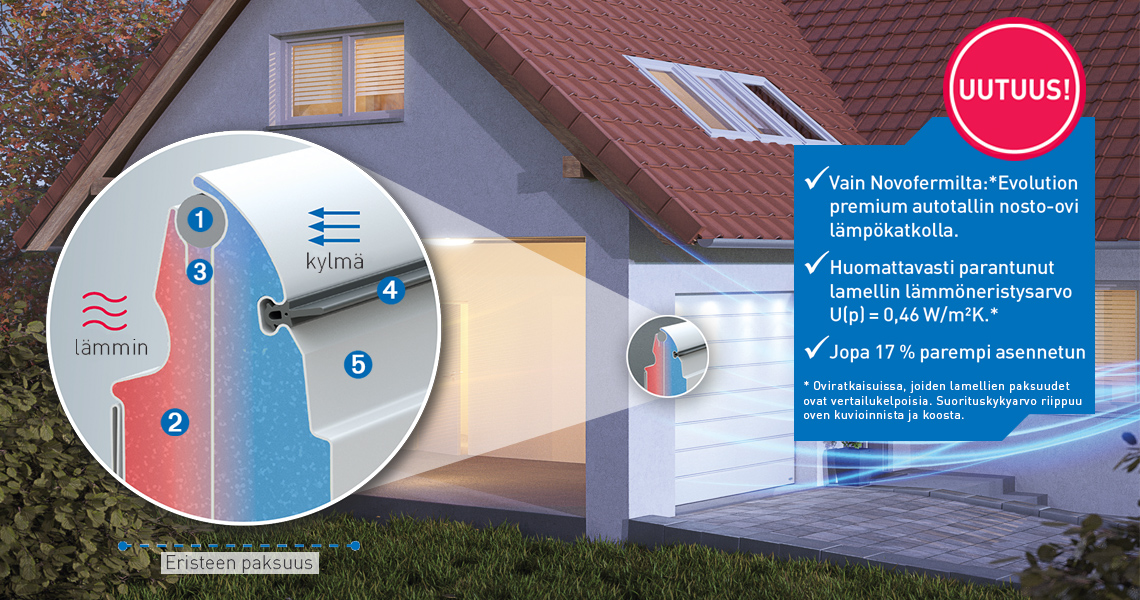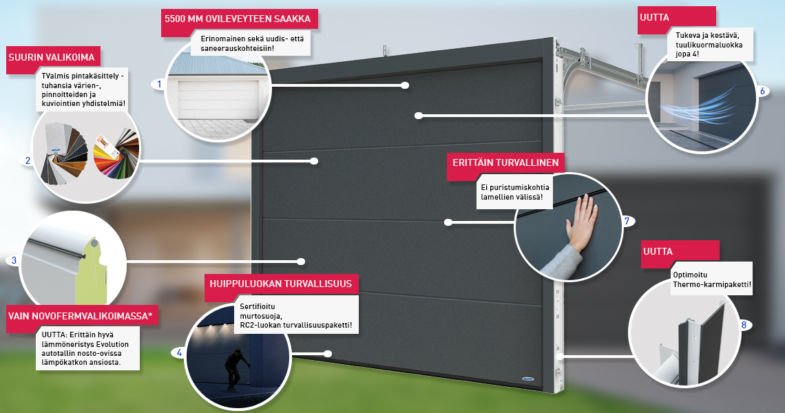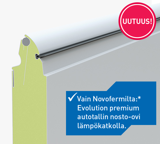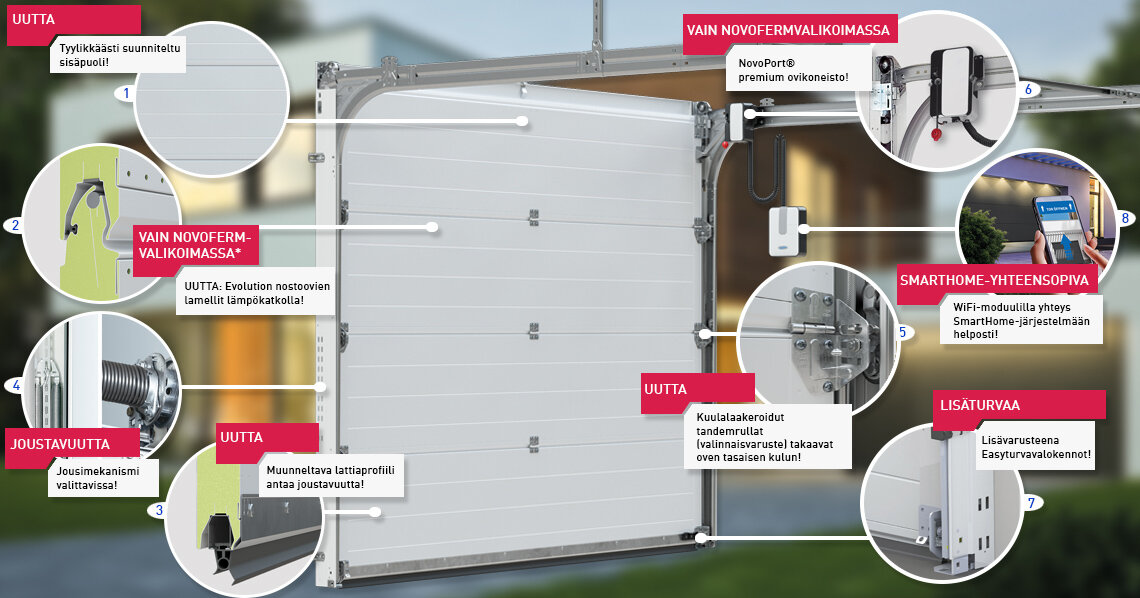 NovoPort®-käyttökoneisto varmistaa parhaan mukavuuden paitsi käytön myös jo asennuksen aikana. Moottori ei tavanomaisten käyttökoneistojen tapaan ole kiinnitetty kattoon vaan se on yksinkertaisesti integroitu sivuovikiskoon – oikealle tai vasemmalle rakenteellisista olosuhteista riippuen.