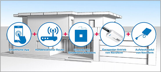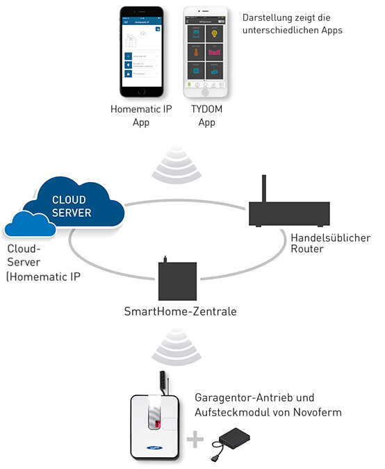 Tämän hyödyntämiseksi tarvitset Novofermin autotallin nosto-oven ja käyttökoneiston lisäksi oikean sovelluksen joltakin SmartHome-kumppaneistamme. Sovelluksen kautta hallitsemista varten autotallioven käyttökoneisto on kytketty tavalliseen reitittimeen vastaavan SmartHome-keskusyksikön ja Novofermin liitäntämoduulin avulla. Koko ratkaisu voidaan määrittää intuitiivisesti kumppanin älypuhelinsovelluksella. Sovellukset ovat saatavilla ilmaiseksi sekä Apple- että Android-laitteille.