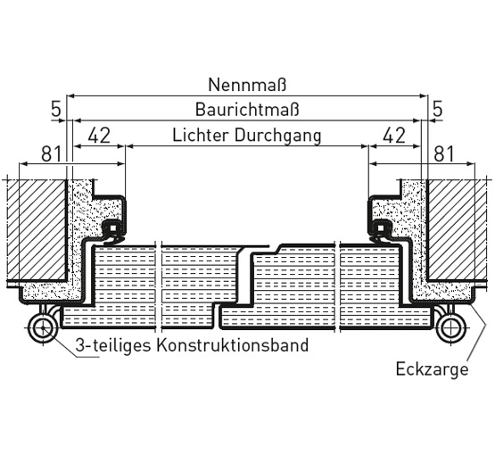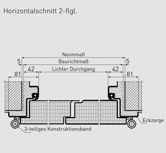 3-teilige Konstruktionsbänder mit Kugellagerringen serienmäßig. Je Flügel zwei Bänder im Standard weiß grundiert ähnlich RAL 9016; optional in Edelstahl, als 3-D verstellbare Bänder in Stahl und Edelstahl oder als schlankes 3-D-Edelstahl-Objektband (Obentürschließer erforderlich) lieferbar. Bei 1-flg. Türen bis BRM-Größe 1000 x 2125 mm ein Konstruktionsband und ein Federband. Ab BRM-Größe 1001 x 2126 und bei allen 2-flg. Türen je Flügel zwei Konstruktionsbänder. Zwei Sicherungszapfen je Türflügel. PZ-Wechselschloss mit schwarzer Rundgriff-Drückergarnitur festdrehbar gelagert. Profilzylinder bauseits (Länge 85 mm, 35/50 mm). 1-flg. Türen standardmäßig mit innenliegender Verstärkung für Obentürschließer auf Bandseite. Ab BRM-Größe 1001 x 2126 mm mit Obentürschließer Geze TS 4000 F oder Dorma TS 89 F.