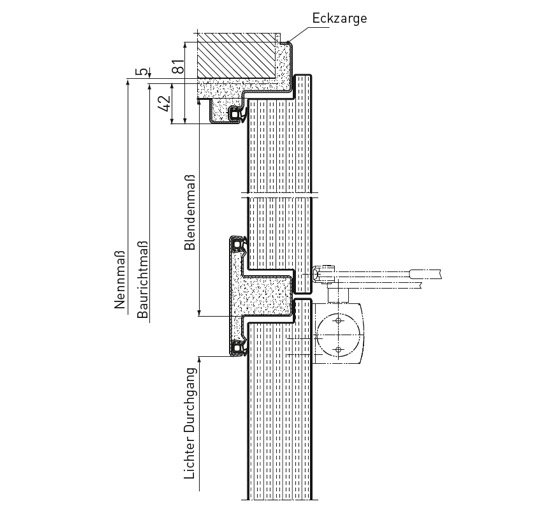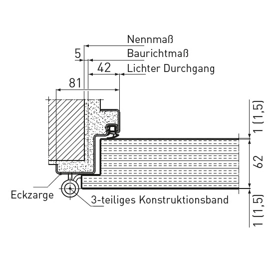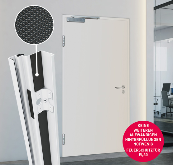 Standard: Eckzarge mit dreiseitigem CR-Dichtungsprofil, 2,0 mm dick, Spiegelbreite 50 mm, wahlweise Umfassungszarge, zweiteilige Umfassungszarge Profil 2140B, Gegenzarge sowie Blockzargen für stumpfen Wandanschluss.
