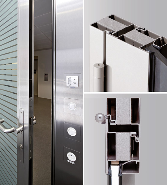 Einfallenschloss, vorgerichtet für Profilzylinder, Drücker- bzw. Wechselgarnituren mit Ovalrosette in Aluminium, Edelstahl oder Kunststoff möglich. Standflügel standardmäßig über die obere Verriegelung des Gehflügels gehalten, alternativ Anti-Panik-Funktion nach DIN EN 179 oder DIN EN 1125 möglich. Gleitschienenobentürschließer nach DIN EN 1154, z. B. GEZE TS 5000 / Dorma TS 93, integrierte Türschließsysteme (GEZE Boxer / Dorma ITS 96), Drehflügeltürantrieb nach DIN 18263 / DIN 18650.